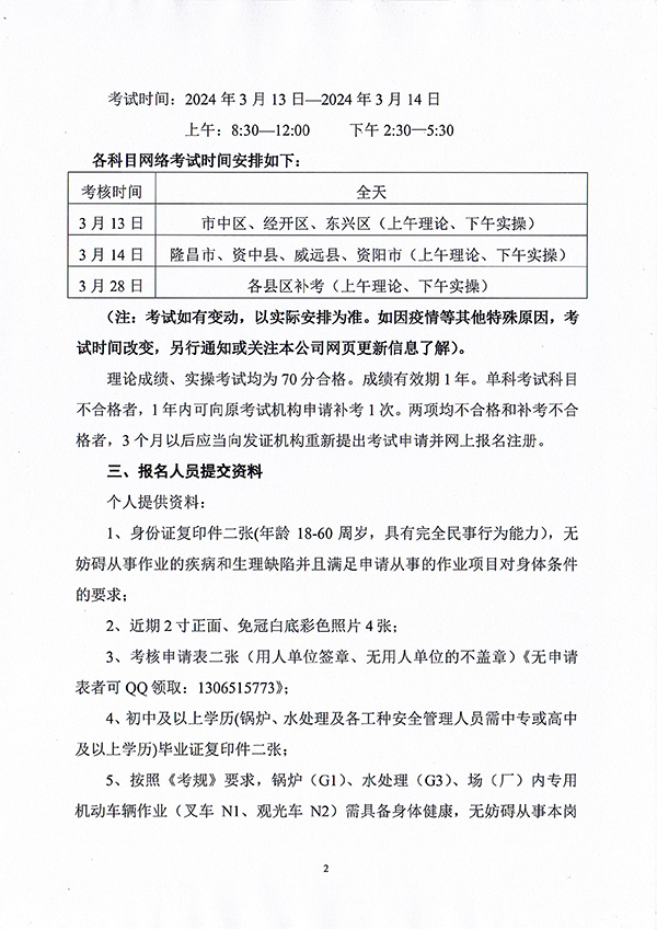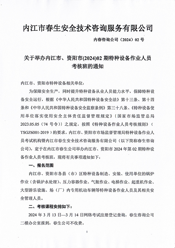 關(guān)于舉辦內江市、資陽(yáng)市(2024)02期特種設備作業(yè)人員考核班的通