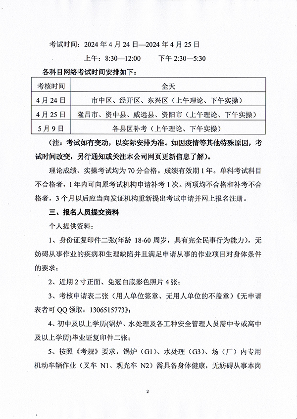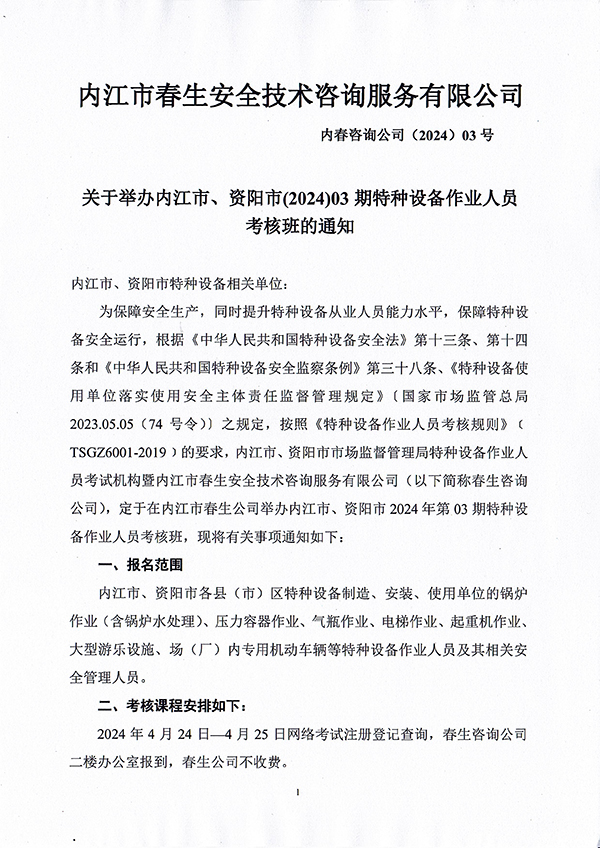 關(guān)于舉辦內江市、資陽(yáng)市(2024)03期特種設備作業(yè)人員考核班的通