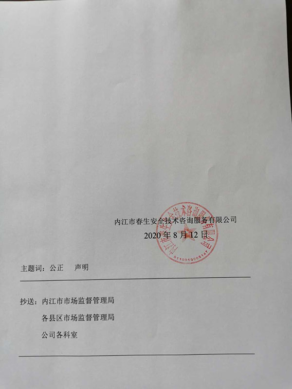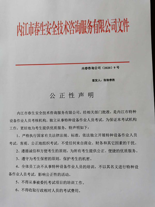 內江春生安全技術(shù)咨詢(xún)服務(wù)有限公司2020年公正性聲明